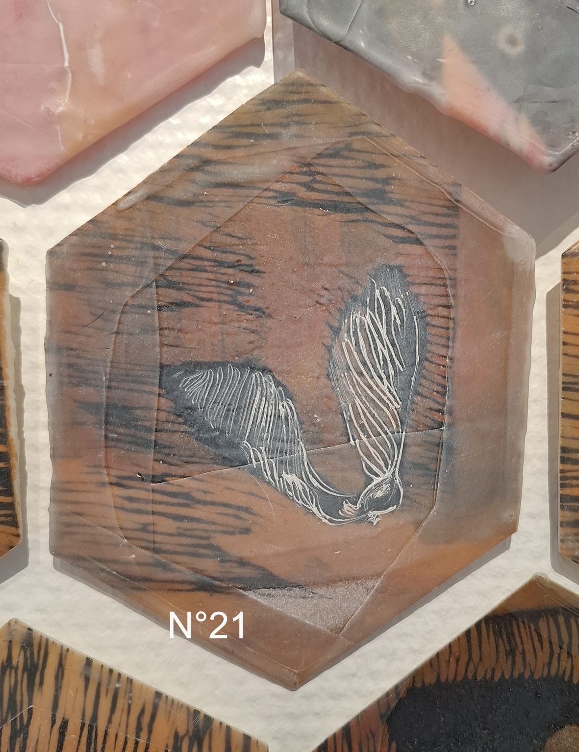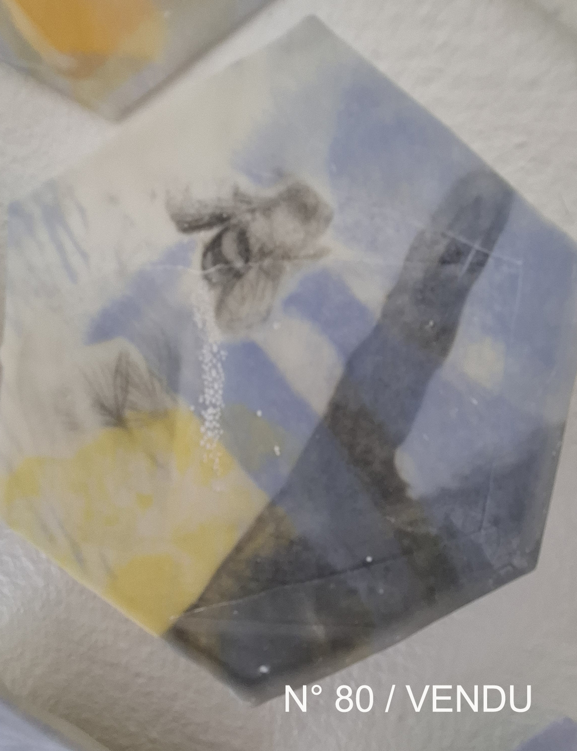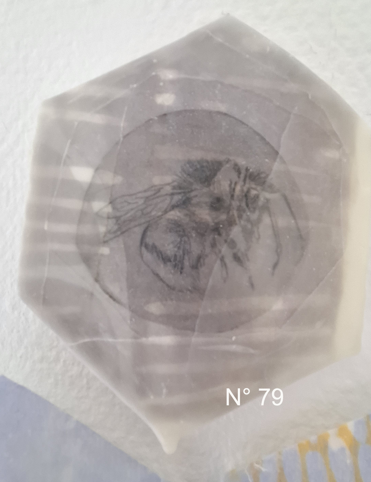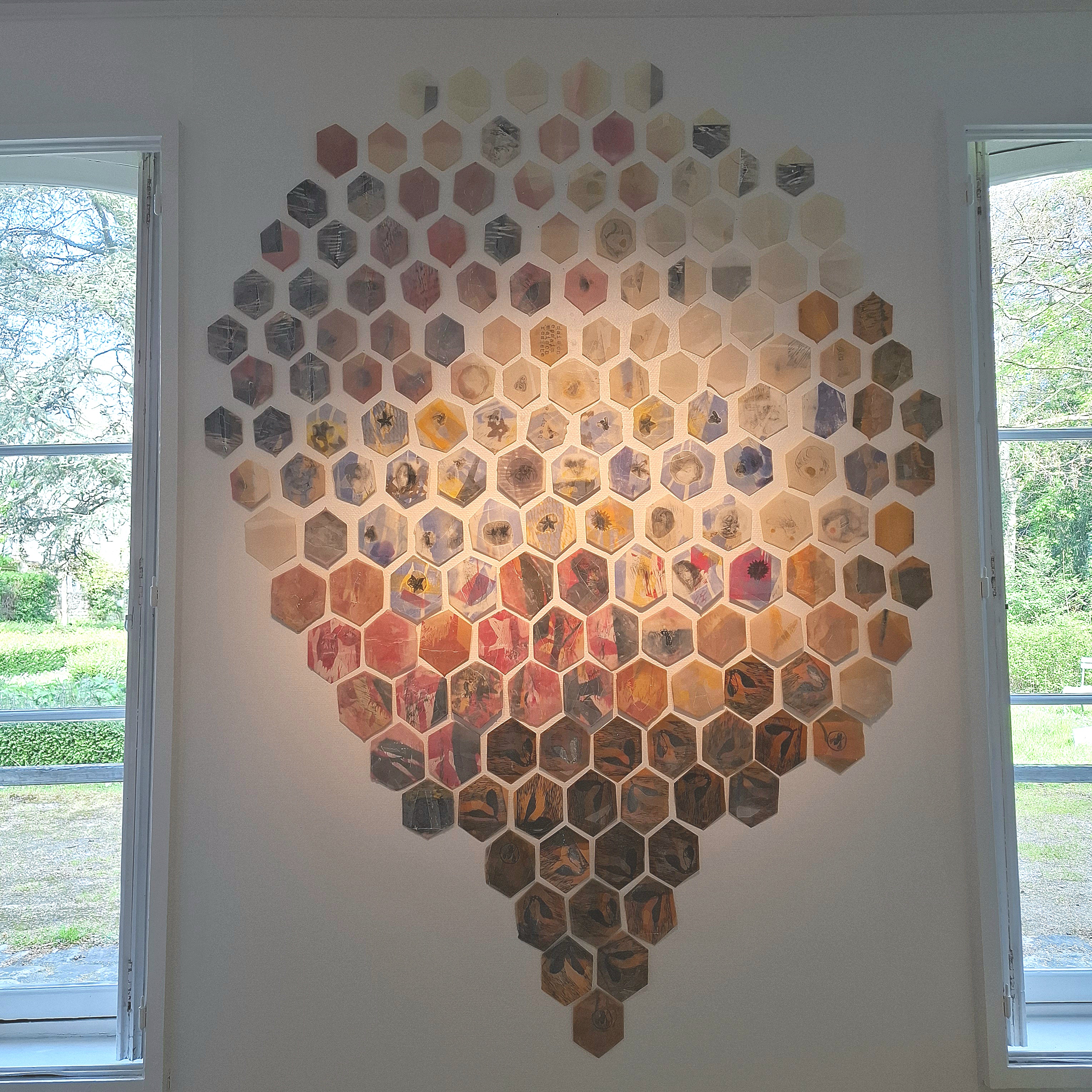 Hexagone mon amour ! est une installation inspirée par la forme du cœur humain et la forme d’un rayon de nid d’abeille. Les hexagones se déploient dans un périmètre de 150 cm x 180 cm, ils sont en papiers gravés, imprimés sur des matrice en bois et en taille douce, le tout est plongé dans de la cire d’abeille.