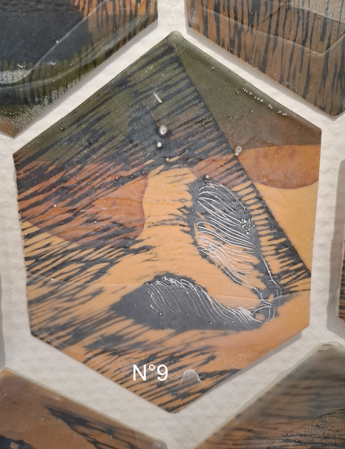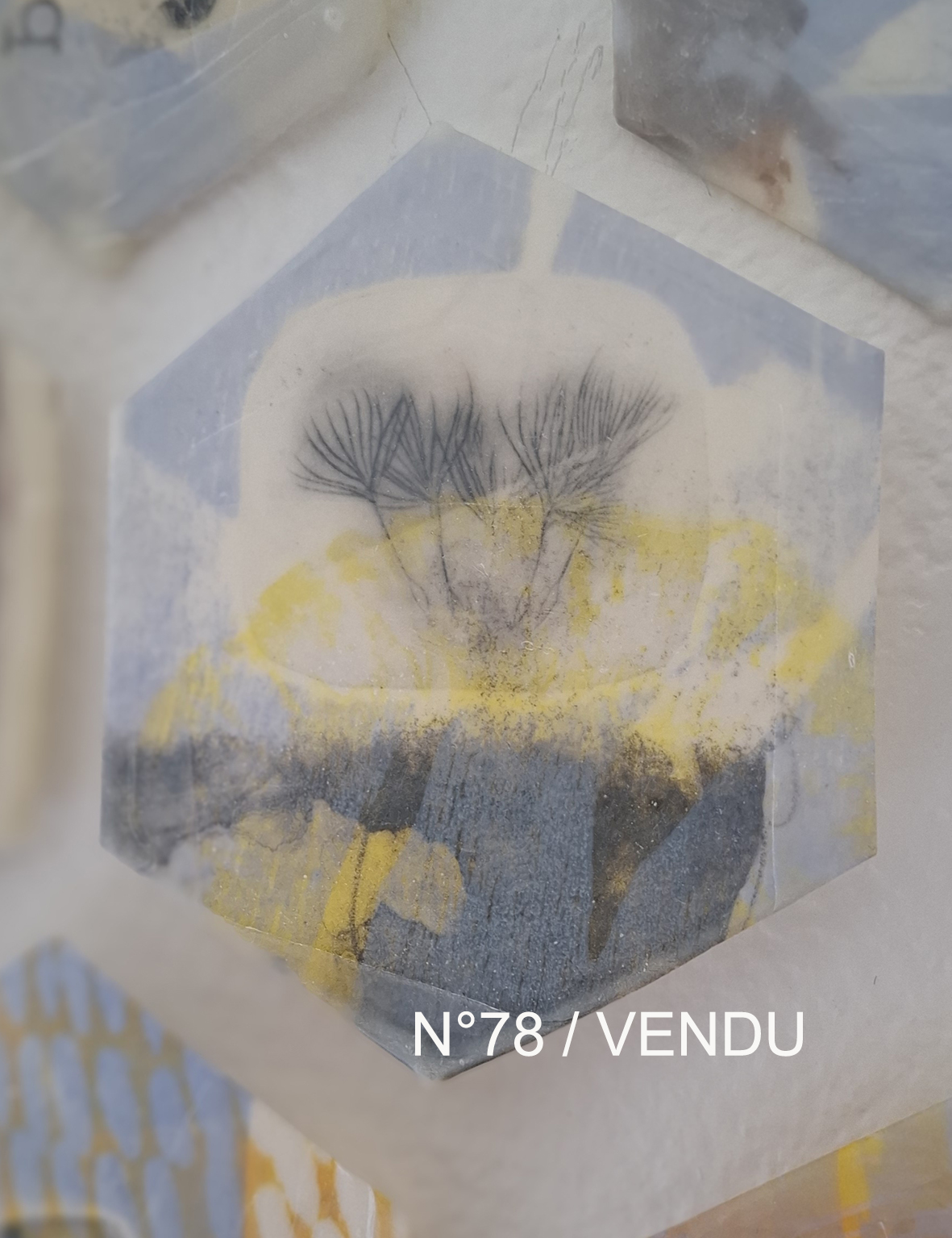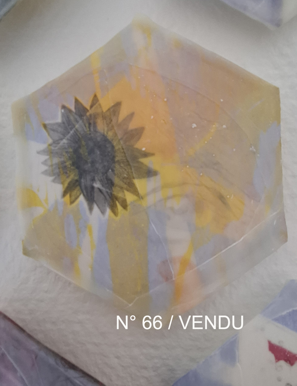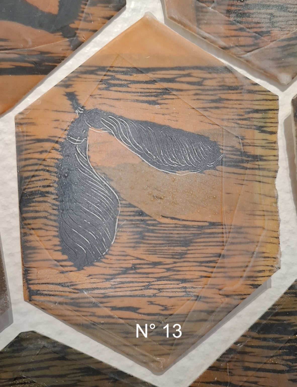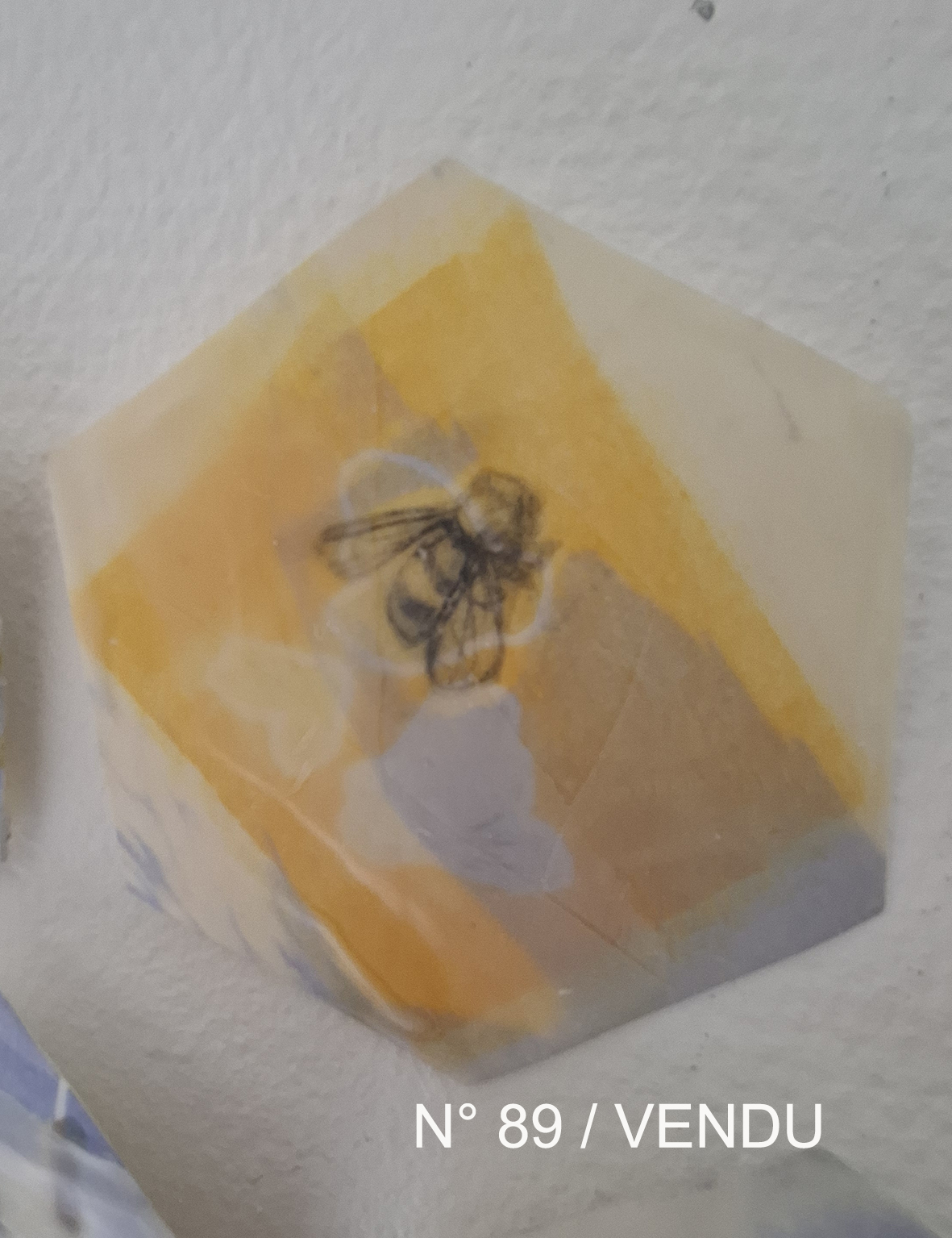 Hexagone mon amour ! est une installation inspirée par la forme du cœur humain et la forme d’un rayon de nid d’abeille. Les hexagones se déploient dans un périmètre de 150 cm x 180 cm, ils sont en papiers gravés, imprimés sur des matrice en bois et en taille douce, le tout est plongé dans de la cire d’abeille.
