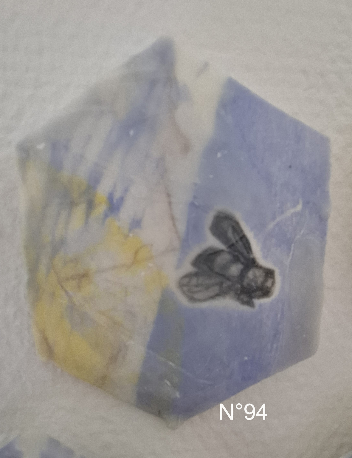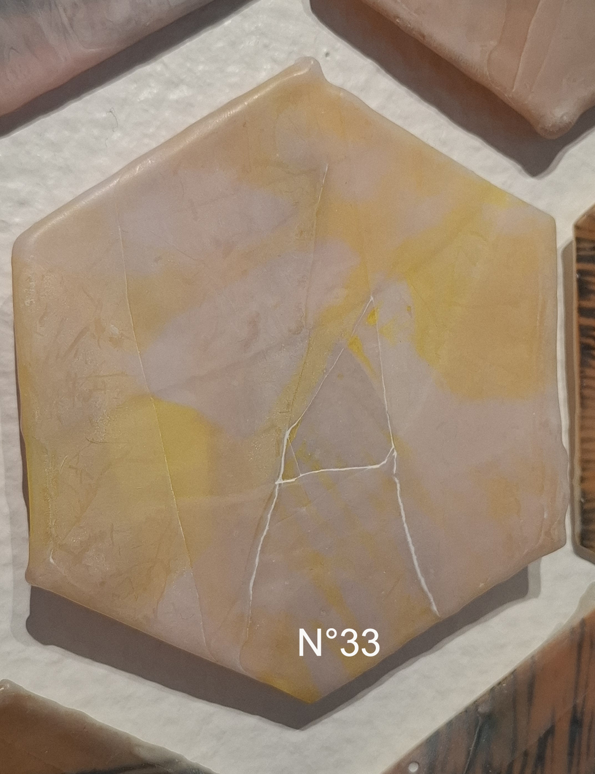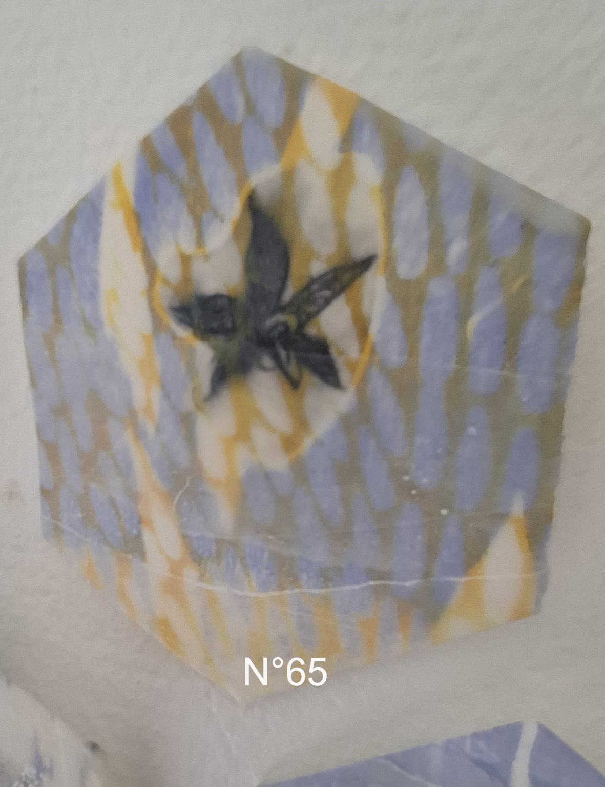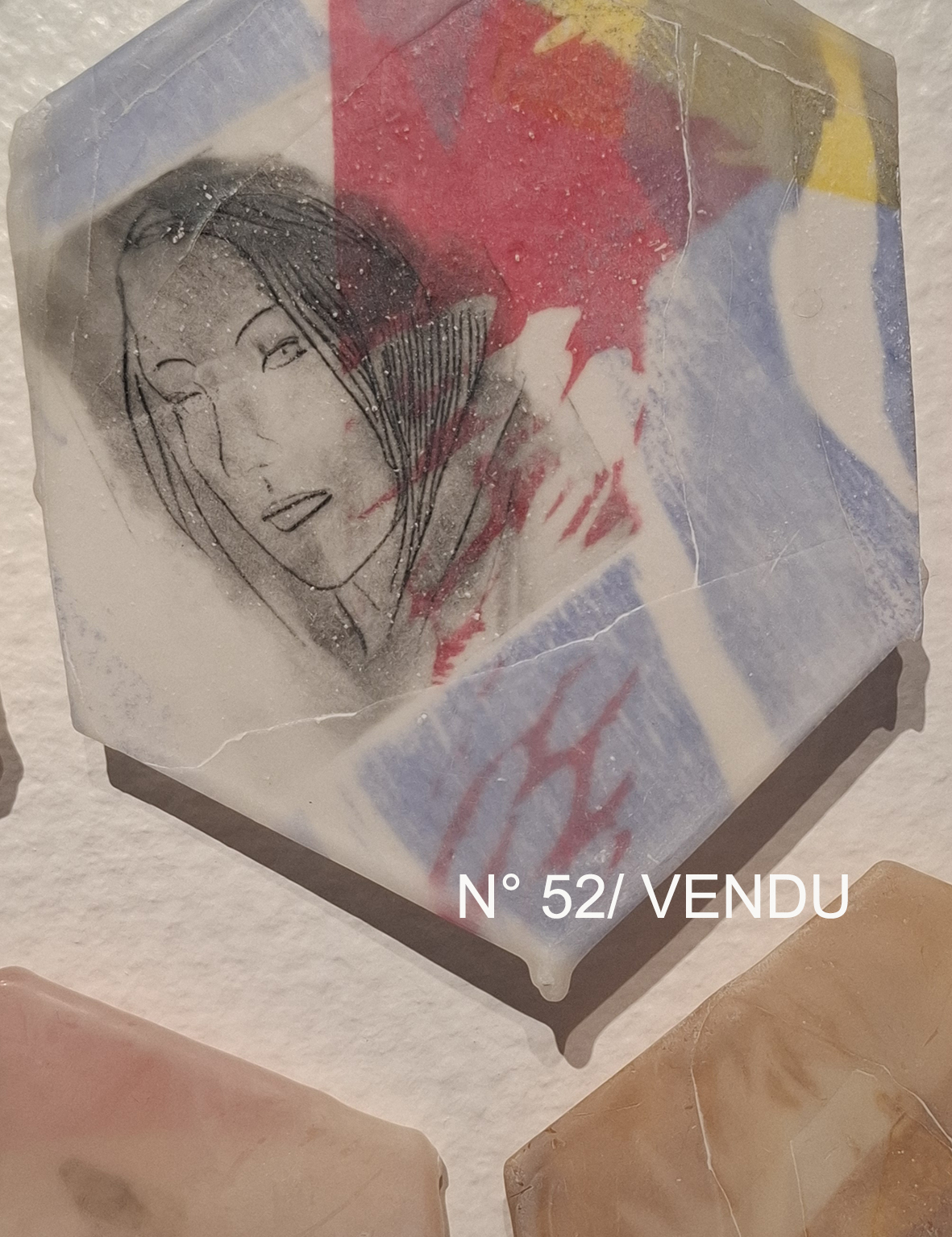 Hexagone mon amour ! est une installation inspirée par la forme du cœur humain et la forme d’un rayon de nid d’abeille. Les hexagones se déploient dans un périmètre de 150 cm x 180 cm, ils sont en papiers gravés, imprimés sur des matrice en bois et en taille douce, le tout est plongé dans de la cire d’abeille.